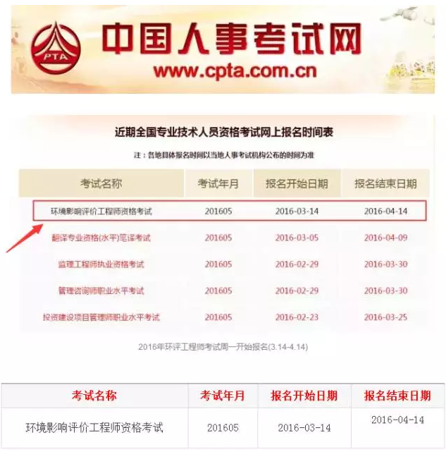 中國人事考試網(wǎng)3月12日公布“近期全國專業(yè)技術人員資格考試網(wǎng)上報名時間表”,其中“環(huán)境影響評價工程師資格考試”報名開始日期2016-03-14,報名結束日期2016-04-14。